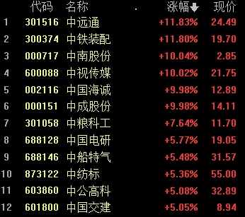 中遠(yuǎn)通(24.490, 0.00, 0.00%)、中郵科技(28.130, 0.00, 0.00%)、中視傳媒、中國海誠、中南股份等走強(qiáng)。