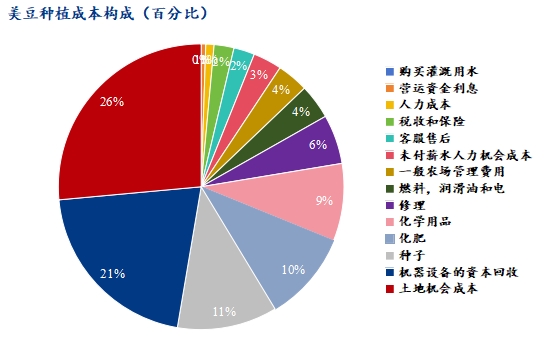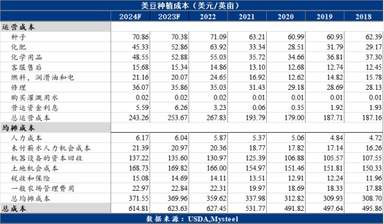 2020年12月下旬,美豆期價觸及1200分/蒲的年度高位,自此之后便開始了大豆高價時代。從上圖我們可以看到自2021年-2023年美豆期價都在1200美分/蒲之上,2022年大豆價格運行區(qū)間更是上移至1300美分/蒲-1750美分/蒲。雖然此時間段有如地緣政治沖突,宏觀經濟,天氣等擾動因素影響了大豆期價的短期走勢,但最終還是需要回歸基本面。而大豆的種植成本就是大豆價格的關鍵影響因素之一,構成大豆的定價中樞。