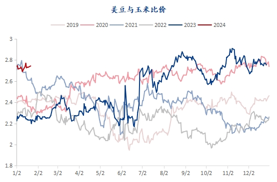 盡管美豆種植收益縮水,但是相較于種植美玉米還是有利可圖。由于美國大豆及玉米種植區(qū)域較為重疊,因此兩者存在“爭地效應”即在不開拓新的種植區(qū)域的情況下,其中一方的種植面積增加意味著另一方的種植面積將會減少。通常市場會關注美豆11月合約和美玉米12月合約的比值來比較新季大豆和玉米的種植偏好,一般在2.5以上的時候可能更偏好于種植大豆,在2.3以下更偏好于種植玉米。從美豆于玉米的比值來看,2024年度美國農民會更傾向于多種大豆。