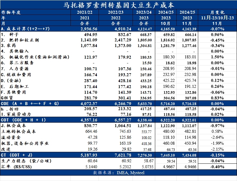 巴西大豆種植成本增加,以巴西頭號主產州馬托格羅索州為例,根據IMEA的數據顯示其2023/24年度的轉基因大豆種植成本為7276.37雷亞爾/公頃.如果將巴西種植成本按照美國標準進行換算:2023 年馬州大豆種植平均成本 ,雷亞爾對美元的匯率按照 5.0計算,單產按照 3.5噸/公頃,則馬州當前成本預估為433.3美元/噸,或者 1174.3美分/蒲式耳。巴西農民按照當前 CBOT 大豆價格計算,依然有獲利空間。因此,巴西農民繼續(xù)擴大大豆種植面積的激勵較強。