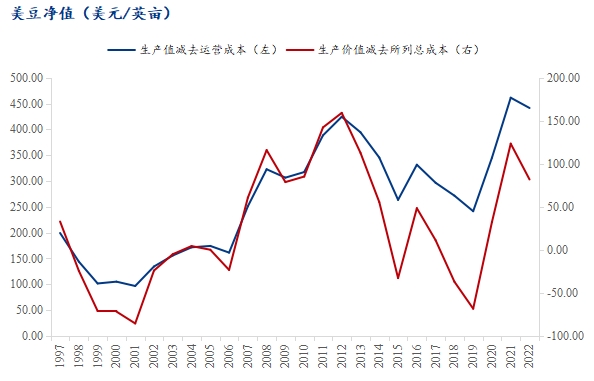 2024年的大豆種植成本或雖有小幅下降,但是種植利潤卻在繼續(xù)縮水。主要原因就是大豆價格高企帶來的高種植利潤推動種植面積的擴張,隨之帶來的產量上漲反作用于大豆價格。衡量美國大豆種植收益的兩個指標:“收入減去營運成本”(左軸)主要反映自有土地農民的收益情況,“收入減去在列的總成本”(右軸),反映的是租地種植的收益情況。