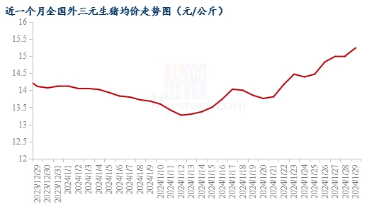 據(jù)Mysteel數(shù)據(jù)監(jiān)測,截至1月29日,全國外三元生豬出欄均價(jià)為15.24元/公斤,較昨日上漲0.23元/公斤。全國豬價(jià)南北齊漲,僅華南小幅走弱。春節(jié)將近,終端拉開備貨序幕,東北外調(diào)積極,中北部養(yǎng)殖端走貨加快,東南部雨雪天氣對(duì)市場情緒及消費(fèi)增長預(yù)期刺激作用明顯,農(nóng)村、鄉(xiāng)鎮(zhèn)消費(fèi)增量,終端市場成交情況好轉(zhuǎn)。短期行情在市場情緒及需求增量影響下或繼續(xù)上漲。