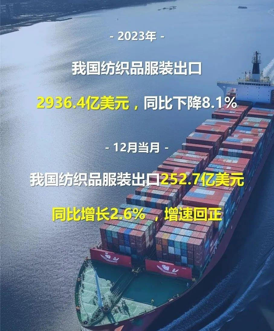 12月當(dāng)月,全國紡織品服裝出口252.7億美元,同比增長2.6%(以人民幣計同比增長4.3%),繼2023年4月之后重新恢復(fù)單月正增長,呈現(xiàn)明顯邊際改善。其中,紡織品出口112.1億美元,同比增長3.5%(以人民幣計同比增長5.2%);服裝出口140.7億美元,同比增長1.9%(以人民幣計同比增長3.5%)。