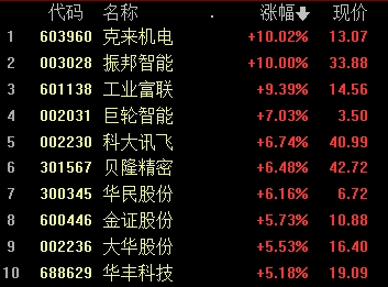 康斯特(16.000, 0.00, 0.00%)、大族數(shù)控(31.840, 0.00, 0.00%)、振邦智能(33.880, 0.00, 0.00%)、克來(lái)機(jī)電(13.070, 0.00, 0.00%)等走強(qiáng)。