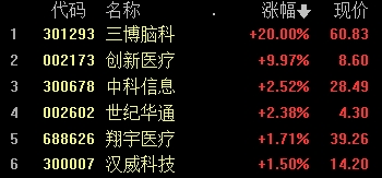 創(chuàng)新醫(yī)療、三博腦科、漢威科技(14.200, 0.00, 0.00%)、東方中科(24.740, 0.00, 0.00%)等多股活躍。