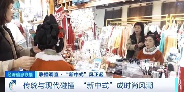 在浙江四季青服裝批發(fā)市場的一家店鋪里,工作人員正在給顧客介紹“新中式”服裝的穿搭。“新中式”羽絨服搭配牛仔褲,讓服飾顯得更加日常,搭配馬面裙則更有中國風。負責人告訴記者,從小朋友穿的拜年服到成人穿的毛衣、羽絨服,“新中式”服飾成了整個批發(fā)市場的主流。