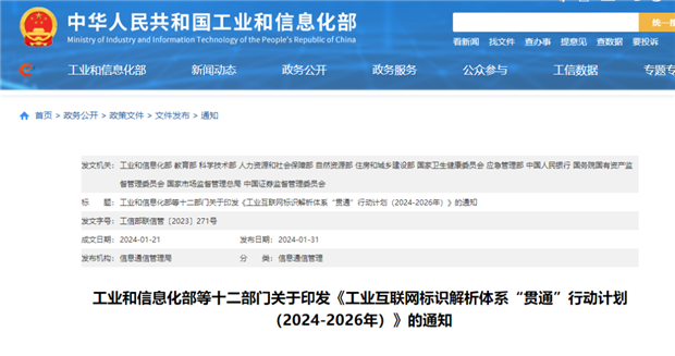 近日,工業(yè)和信息化部、教育部、科學(xué)技術(shù)部等十二部門聯(lián)合印發(fā)《工業(yè)互聯(lián)網(wǎng)標(biāo)識解析體系“貫通”貫通行動計(jì)劃(2024-2026年)》(以下簡稱《行動計(jì)劃》),提出到2026年,我國建成自主可控的標(biāo)識解析體系,在制造業(yè)及經(jīng)濟(jì)社會重點(diǎn)領(lǐng)域初步實(shí)現(xiàn)規(guī)模應(yīng)用,對推動企業(yè)數(shù)字化轉(zhuǎn)型、暢通產(chǎn)業(yè)鏈供應(yīng)鏈、促進(jìn)大中小企業(yè)和一二三產(chǎn)業(yè)融通發(fā)展的支撐作用不斷增強(qiáng)。據(jù)悉,這是第一份針對工業(yè)互聯(lián)網(wǎng)標(biāo)識解析體系出臺的政策文件。