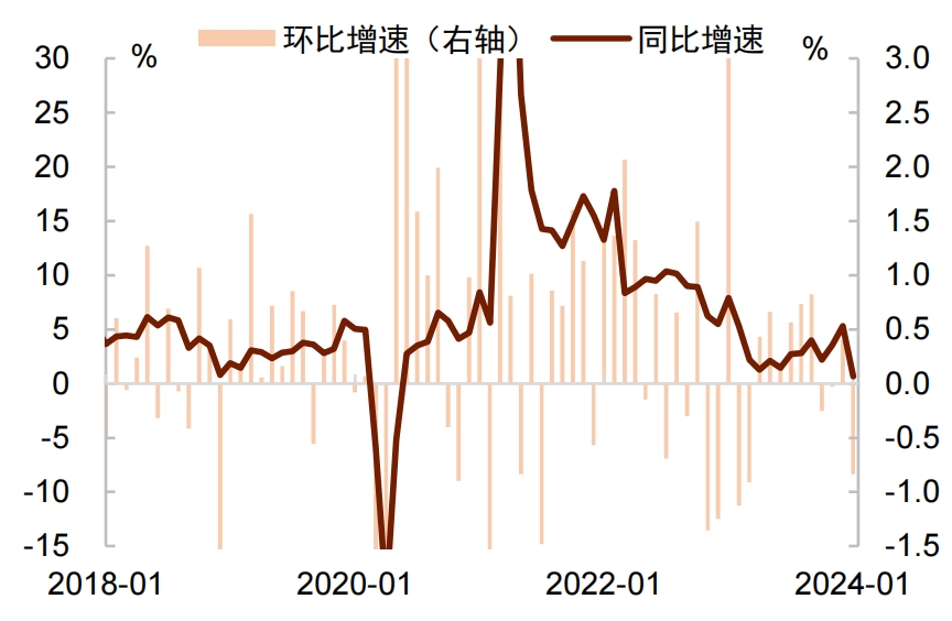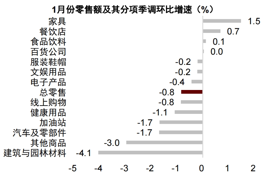 美國1月份零售銷售額季調(diào)環(huán)比下降0.8%,而市場預(yù)期下降0.2%,且降幅為近一年來最大(圖表3)。從分項(xiàng)看,零售額的下降是廣泛的,在13個(gè)類別中有9個(gè)類別的銷售出現(xiàn)下降,其中,建筑與園林材料(-4.1%)拖累最大,其次是其他商品(-3.0%)和汽車及零部件(-1.7%),表現(xiàn)較好的是家具(+1.5%)和餐飲店(+0.7%),但這些不足以抵消其他項(xiàng)目的萎縮(圖表4)。