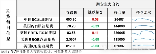 【1】因美國總統(tǒng)日提前休市,WTI主力原油期貨停盤時跌0.26美元,跌幅0.33%,報78.2美元/桶;布倫特主力原油期貨收漲0.09美元,漲幅0.11%,報83.56美元/桶;INE原油期貨收漲0.58%,報603.8元。