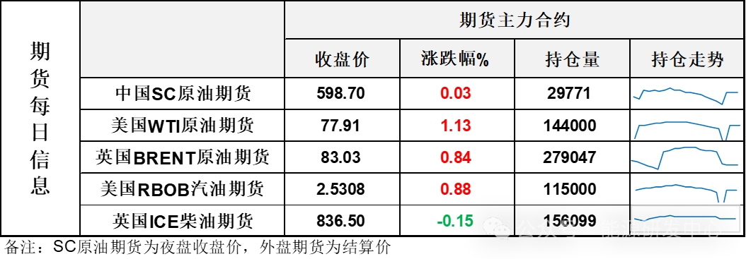 【1】WTI主力原油期貨收漲0.87美元,漲幅1.13%,報(bào)77.91美元/桶;布倫特主力原油期貨收漲0.69美元,漲幅0.84%,報(bào)83.03美元/桶;INE原油期貨收漲0.03%,報(bào)598.7元。
