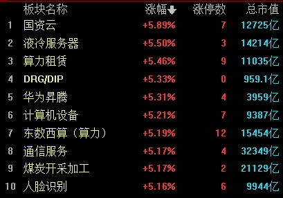 盤面上,國(guó)資云、液冷服務(wù)器、煤炭、算力板塊漲幅居前。