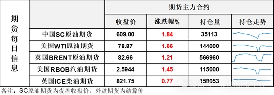【1】WTI主力原油期貨收漲1.29美元,漲幅1.66%,報(bào)78.87美元/桶;布倫特主力原油期貨收漲0.99美元,漲幅1.21%,報(bào)82.66美元/桶;INE原油期貨收漲1.84%,報(bào)609元。