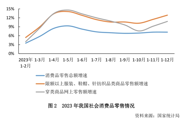 內(nèi)銷方面,隨著國家一系列促銷費政策的持續(xù)發(fā)力、線下消費場景逐步恢復(fù)、購物節(jié)等多種促銷手段的推進激發(fā)消費熱情,國內(nèi)市場呈現(xiàn)回暖遞進。2023年,全年國內(nèi)生產(chǎn)總值超126萬億元,比上年增長5.2%。全年社會消費品零售總額約47萬億元,比上年增長7.2%,增幅較2022年提高7.4個百分點。其中,限額以上服裝、鞋帽、針紡織品類商品零售額同比增長12.9%,實物商品網(wǎng)上穿類商品零售額同比增長10.8%。