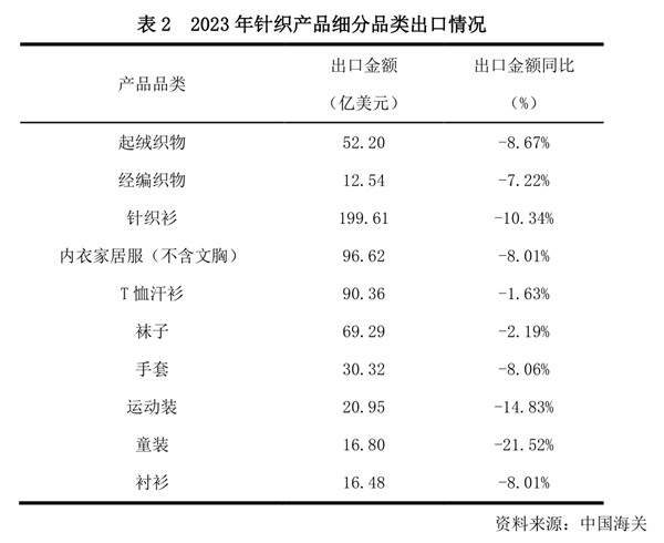從細分品類來看, 2023年T恤衫、襪子等產(chǎn)品出口降幅較小。其中起絨織物、內(nèi)衣家居服的出口降幅明顯收窄,較上半年分別收窄4.55和5.00個百分點。