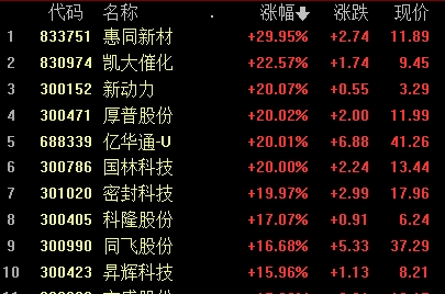 新動力、國林科技、密封科技(17.960, 2.99, 19.97%)、厚普股份等多股走強。