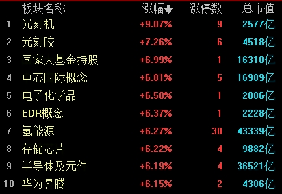 盤面上,光刻機、氫能源、存儲芯片、汽車整車板塊漲幅居前。