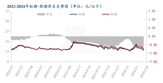 根據(jù)Mysteel農(nóng)產(chǎn)品數(shù)據(jù)顯示,本周全國標(biāo)肥豬價差均價在-0.52元/公斤,較上周價差縮小0.19,本周標(biāo)肥價差縮窄。主要原因正月十五之后需求增量,標(biāo)豬價格持續(xù)反彈,大肥需求逐步減弱,購銷清淡,標(biāo)豬價格走高,標(biāo)肥價差進一步縮小。標(biāo)肥價差的持續(xù)收窄可能對市場各方產(chǎn)生一系列的影響和風(fēng)險。養(yǎng)殖戶可能面臨豬肉銷售收益減少的壓力,而消費者則在選擇購買豬肉時受到更為有限的價格差異刺激,影響其購買決策。此外,整個產(chǎn)業(yè)鏈中的中間環(huán)節(jié),如屠宰廠和批發(fā)商,也需要對標(biāo)肥價差的變化做出相應(yīng)的調(diào)整以適應(yīng)市場的變化。