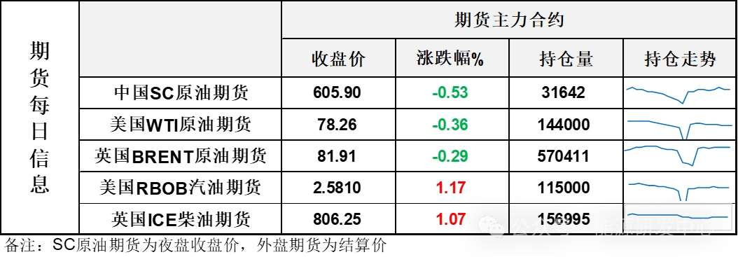 【1】WTI主力原油期貨收跌0.28美元,跌幅0.36%,報(bào)78.26美元/桶;布倫特主力原油期貨收跌0.24美元,跌幅0.29%,報(bào)81.91美元/桶;INE原油期貨收跌0.53%,報(bào)605.9元。