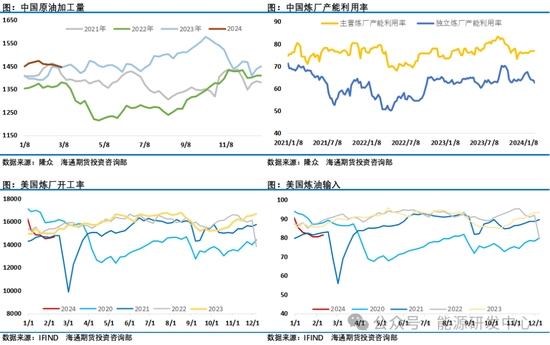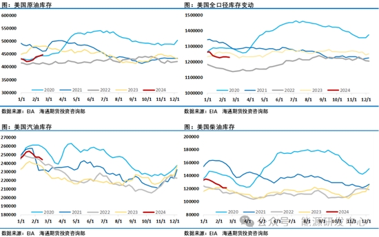 需求層面,國內(nèi)柴油市場周末持續(xù)走強(qiáng),在此之前的2月份這個(gè)傳統(tǒng)假日期間表現(xiàn)平淡,尤其是春節(jié)之后的一次大型極端寒潮天氣席卷全國進(jìn)一步延遲了國內(nèi)成品油消費(fèi)的啟動(dòng),因此前期整體表現(xiàn)較弱,從2月底開始國內(nèi)柴油市場開始有所回暖,汽油市場則隨著假期出行結(jié)束表現(xiàn)較弱,二者裂解差出現(xiàn)強(qiáng)弱轉(zhuǎn)換,這一汽柴市場強(qiáng)弱局勢(shì)未來一段時(shí)間預(yù)計(jì)仍將延續(xù)。海外市場需求層面2月份同樣沒有明顯亮點(diǎn)表現(xiàn),尤其是柴油市場較弱,這一點(diǎn)從裂解差這一高頻指標(biāo)持續(xù)回落得到充分體現(xiàn)??傮w來看需求端較2月份糟糕的表現(xiàn)預(yù)計(jì)接下來有回暖預(yù)期,但目前對(duì)提升市場信心上還不夠,對(duì)油價(jià)沒有形成有效推力。庫存方面雖然原油是季節(jié)性累庫階段,但EIA周度數(shù)據(jù)顯示目前石油市場庫存層面對(duì)油價(jià)沒有形成壓力,同時(shí)美國在持續(xù)的回補(bǔ)戰(zhàn)略原油儲(chǔ)備額外增加了原油采購需求,庫存表現(xiàn)整體有助于油價(jià)反彈的延續(xù)。