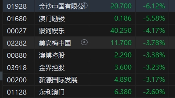 濠賭股全天萎靡,金沙中國(guó)跌超6%。高盛發(fā)表報(bào)告指出,澳門(mén)2月份賭收185億澳門(mén)元,為疫情前水平的70%,相對(duì)于1月及去年12月為78%及81%明顯回落,似乎是受累于春節(jié)假期后放緩幅度超出預(yù)期。日均賭收由2月份的首兩周約7.15億澳門(mén)元,回落至過(guò)去兩周的5.43億澳門(mén)元,返回去年底水平。此外,該行提及澳門(mén)每日入境旅客量也下降至約8萬(wàn)人次,相當(dāng)于2019年水平約72%(相對(duì)于新春期間恢復(fù)至約100%)。