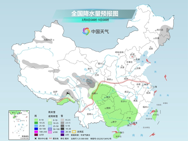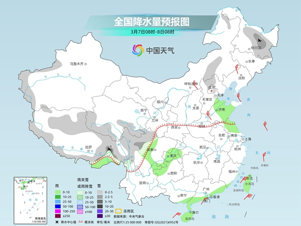 今天,南方降水繼續(xù)縮減,中東部大部將維持晴朗的天氣格局。中央氣象臺(tái)預(yù)計(jì),內(nèi)蒙古中東部、河北北部、黑龍江中部、新疆伊犁河谷和南疆西部山區(qū)、西藏西部和東部、青海南部、川西高原北部等地部分地區(qū)有小雪或雨夾雪,其中,黑龍江中東部、西藏東南部、川西高原北部等地部分地區(qū)有中到大雪。西藏南部、山東大部、江蘇中北部、四川盆地西部、重慶大部、貴州西北部、廣西東南部沿海、廣東南部、海南島、臺(tái)灣島等地部分地區(qū)有小雨。