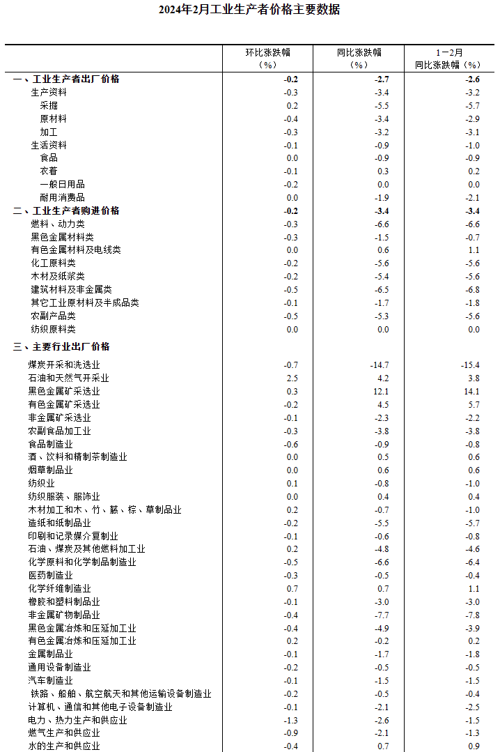 2024年2月份,全國(guó)工業(yè)生產(chǎn)者出廠價(jià)格同比下降2.7%,環(huán)比下降0.2%;工業(yè)生產(chǎn)者購(gòu)進(jìn)價(jià)格同比下降3.4%,環(huán)比下降0.2%。1—2月平均,工業(yè)生產(chǎn)者出廠價(jià)格比上年同期下降2.6%,工業(yè)生產(chǎn)者購(gòu)進(jìn)價(jià)格下降3.4%。