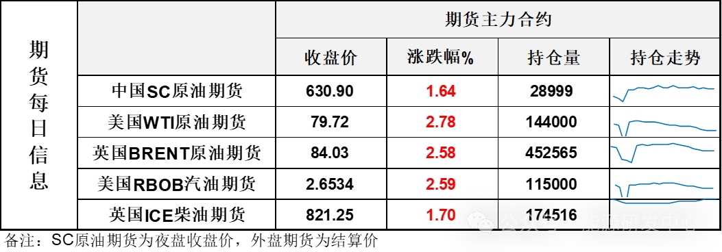 【1】WTI主力原油期貨收漲2.16美元,漲幅2.78%,報79.72美元/桶;布倫特主力原油期貨收漲2.11美元,漲幅2.58%,報84.03美元/桶;INE原油期貨收漲1.64%,報630.9元。
