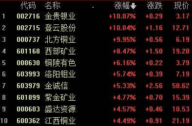 北方銅業(yè)、銅陵有色(3.790, 0.00, 0.00%)、云南銅業(yè)(11.990, 0.00, 0.00%)、西部礦業(yè)(19.200, 0.00, 0.00%)等多股走強。