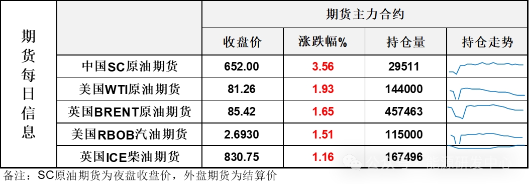 【1】WTI主力原油期貨收漲3.7美元,漲幅1.93%,報81.26美元/桶;布倫特主力原油期貨收漲1.39美元,漲幅1.65%,報85.42美元/桶;INE原油期貨收漲3.56%,報652元。