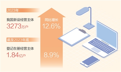 國家市場(chǎng)監(jiān)督管理總局日前發(fā)布數(shù)據(jù)顯示:2023年,我國新設(shè)經(jīng)營(yíng)主體3273萬戶,同比增長(zhǎng)12.6%。其中,新設(shè)企業(yè)1002.9萬戶,增長(zhǎng)15.6%;新設(shè)個(gè)體工商戶2258.2萬戶,增長(zhǎng)11.4%。