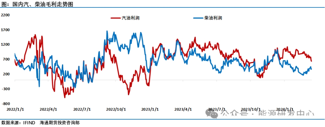 庫存方面,IEA判斷石油水上儲存量達(dá)到自新冠疫情高峰以來的第二高水平。全球陸上石油庫存連續(xù)第七個月下降,降至至少2016年以來的最低水平。EIA周度庫存數(shù)據(jù)顯示除卻戰(zhàn)略儲備的商業(yè)原油庫存減少153.6萬桶至4.47億桶,降幅0.34%。戰(zhàn)略石油儲備(SPR)庫存增加59.6萬桶至3.616億桶,增幅0.17%。庫欣庫存減少22萬桶,汽油庫存減少566.2桶,預(yù)期減少180萬桶;精煉油庫存增加88.8萬桶,預(yù)期減少15萬桶。美國至3月8日當(dāng)周EIA汽油庫存降幅錄得2023年11月3日當(dāng)周以來最大,為連續(xù)第6周錄得下降。精煉油庫存增幅錄得2024年1月12日當(dāng)周以來最大,結(jié)束此前連續(xù)7周的下降趨勢。整體來看石油市場庫存整體處于降庫階段對油價友好。