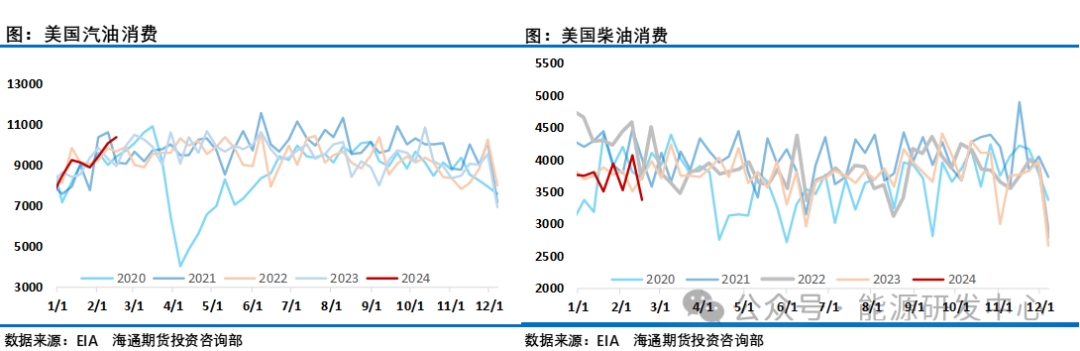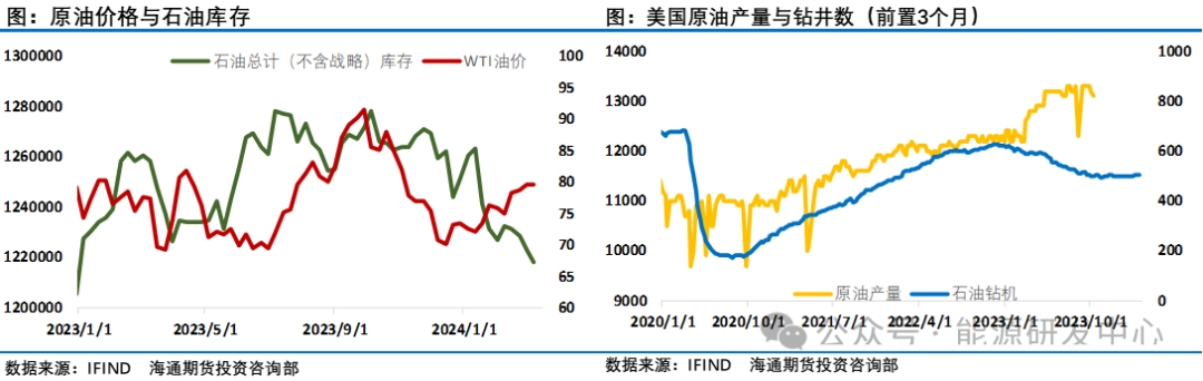 對于供應(yīng)IEA判斷全球石油供應(yīng)將在2024年增加80萬桶/日,達(dá)到1.029億桶/日。由于歐佩克+減產(chǎn)措施,2024年全年石油市場將面臨供應(yīng)不足。歐佩克+今年晚些時候似乎還有提高石油產(chǎn)量的空間。如果歐佩克解除減產(chǎn)措施,石油市場可能在下半年出現(xiàn)供應(yīng)過剩。俄羅斯2月原油產(chǎn)量增加2萬桶/日至942萬桶。OPEC公布最新月度原油市場報告。月報顯示,盡管歐佩克+實(shí)施新的自愿減產(chǎn)措施,但由利比亞和尼日利亞帶動,原油產(chǎn)量在2月份增加了20.3萬桶/日,達(dá)到2657萬桶/日。而EIA短期能源展望中預(yù)計2024年美國原油產(chǎn)量將增加26萬桶/日,此前預(yù)期為增加17萬桶/日。預(yù)計2025年美國原油產(chǎn)量將增加46萬桶/日,此前為增加39萬桶/日。預(yù)計2024年美國原油產(chǎn)量為1319萬桶/日,此前預(yù)期為1310萬桶/日。預(yù)計2025年美國原油產(chǎn)量為1365萬桶/日,此前預(yù)期為1349萬桶/日。不過最近EIA周度數(shù)據(jù)顯示近期美國原油產(chǎn)量連續(xù)第二周下滑10萬桶/日,目前只有1310萬桶/日。