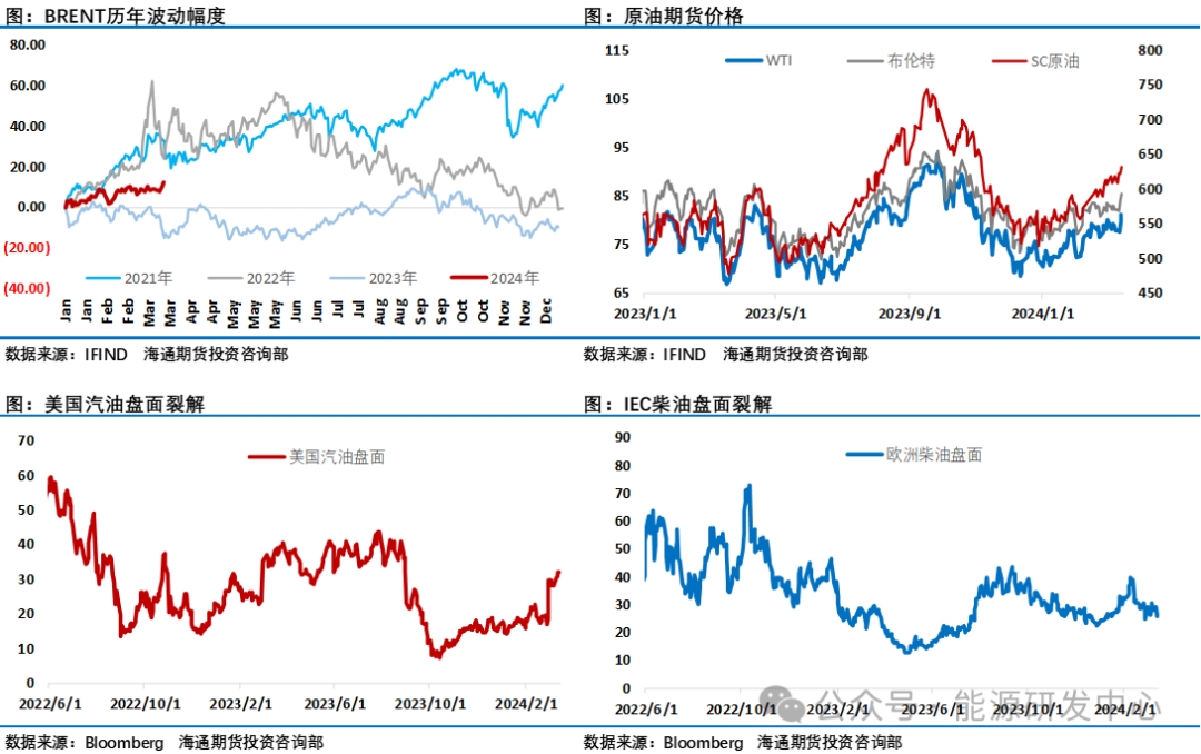 值得注意的是當(dāng)前各機(jī)構(gòu)對油市判斷是預(yù)期為主,而且其中暗含的一個推演是歐佩克+會將減產(chǎn)延長至年底,各機(jī)構(gòu)月報提供樂觀預(yù)期先行的同時烏克蘭無人機(jī)襲擊俄羅斯煉廠等地緣事件適時上演,進(jìn)一步增加了投資者對供應(yīng)緊張的擔(dān)憂,看漲情緒升溫推動了現(xiàn)階段油價走強(qiáng)。在油價上行同時我們觀察到周五油價震蕩微跌同時,月差卻回落明顯,月差結(jié)構(gòu)變化明顯弱于同期油價的表現(xiàn)顯然不能匹配油價大漲的強(qiáng)勢格局,這也意味著油價過去幾天的上行突破行情的核心驅(qū)動是基于預(yù)期改善帶來的情緒化推動,供應(yīng)層面并沒有那么緊張。當(dāng)然石油市場確實(shí)也存在一些積極信號,目前原油市場庫存結(jié)構(gòu)健康對油價沒有壓力,另外需求端在過去一段時間內(nèi)美國汽油裂解差持續(xù)走強(qiáng),中國市場柴油同樣大幅走強(qiáng),需求端在近期與原油的上漲形成了良好的正向互動,為投資者看漲油價提供了動力。一季度在預(yù)期主導(dǎo)下油價累計上漲近15美元,累計漲幅較大,油價在本周發(fā)力上漲后也突破了過去一個多月的盤局,但后續(xù)供需層面能否持續(xù)為油價帶來上行仍有待時間來給出答案,油價上漲后歐佩克+減產(chǎn)執(zhí)行是否會有松動也值得關(guān)注,預(yù)計油價很難走出持續(xù)大幅上漲,后市大概率仍會有震蕩反復(fù)。