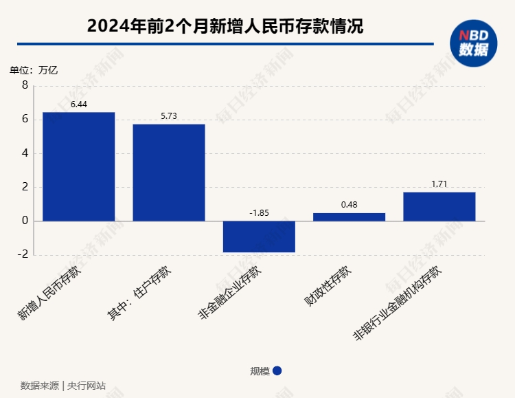 與此同時,記者注意到,前兩個月人民幣存款增加6.44萬億元,這與同時期新增的6.37億元人民幣貸款規(guī)模相當(dāng),其中,住戶存款增加5.73萬億元,占比近89%。再具體看,2月份住戶存款新增3.2萬億元,創(chuàng)2023年2月以來新高。