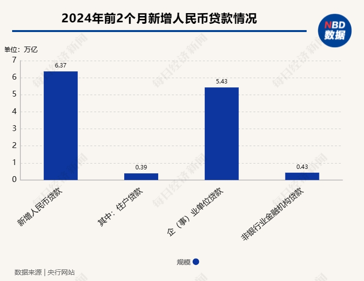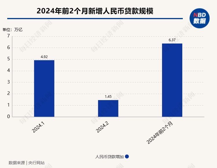 數(shù)據(jù)顯示,2024年前兩個月人民幣貸款增加6.37萬億元,2月新增人民幣貸款較1月有所回落。記者注意到,2024年1月新增人民幣貸款為4.92萬億元,2月的數(shù)據(jù)為1.45萬億元。