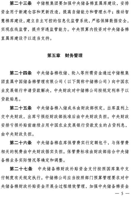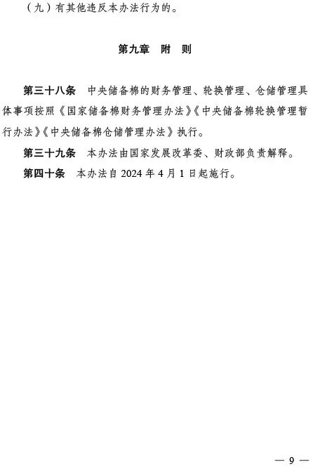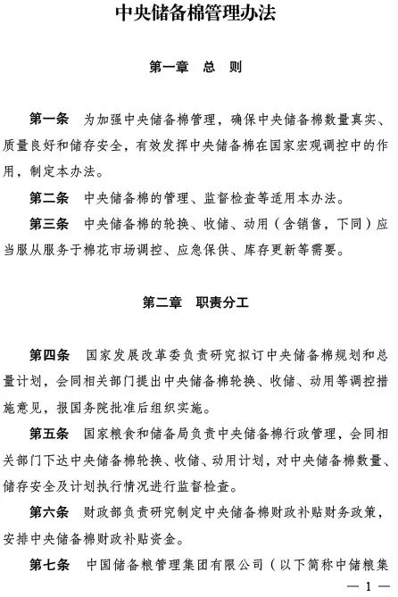 日前,國家發(fā)展改革委、財政部聯(lián)合印發(fā)《中央儲備棉管理辦法》(以下簡稱《辦法》),該《辦法》是為了貫徹落實黨中央、國務(wù)院關(guān)于加強(qiáng)儲備體系建設(shè)的決策部署,進(jìn)一步強(qiáng)化中央儲備棉管理,更好發(fā)揮中央儲備棉在宏觀調(diào)控中的作用。自2024年4月1日起《辦法》正式施行。