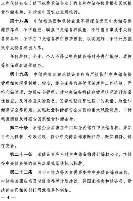 二是明確職責(zé)程序。界定國家發(fā)展改革委、國家糧食和儲備局、財政部等部門和單位在中央儲備棉管理中的職責(zé),并規(guī)定了中央儲備棉計劃下達(dá)程序、執(zhí)行報告要求和操作方式等。