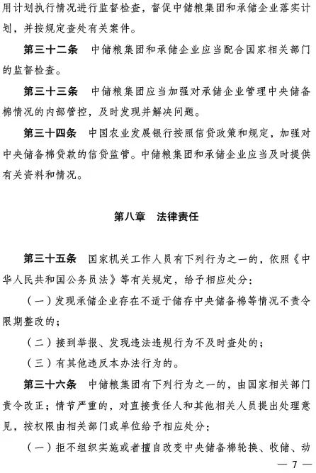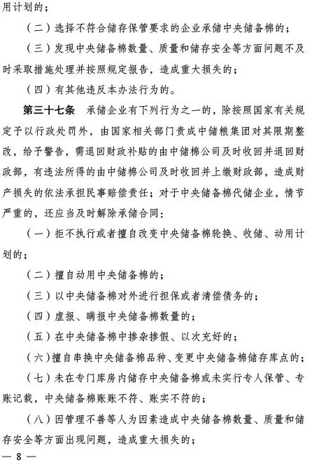 四是加強(qiáng)監(jiān)督檢查。明確相關(guān)部門對中央儲備棉管理情況和輪換、收儲、動用計劃執(zhí)行情況的監(jiān)督檢查職責(zé)、職權(quán),并對違反辦法規(guī)定的行為予以相應(yīng)處罰。