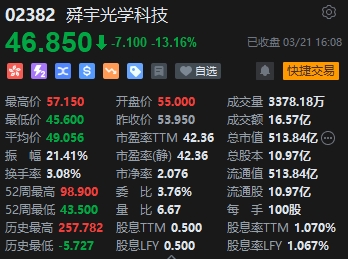 電子零件板塊低迷,舜宇光學科技績后跌超13%。消息面上,舜宇2023年收入316.8億元,同比跌4.6%,且低于市場預期的323.1億元;純利約11億元,同比跌54.3%,且低于市場預期的12.7元;毛利同比跌30.5%至45.9億元,毛利率跌5.4個百分點至14.5%。派末期股息每股0.219港元,同比跌56.2%,股息率約0.4%。