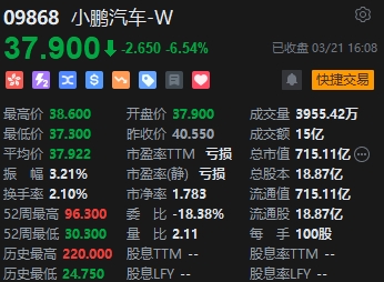 小鵬汽車挫逾6%。消息面上,當?shù)貢r間3月20日,小鵬汽車在美國證券交易委員會提交的文件顯示,阿里巴巴旗下淘寶中國控股有限公司(Taobao China Holding Limited)計劃出售3300萬份小鵬汽車ADS,總價值約3.14億美元(約22.61億元人民幣)。這并不是阿里首次減持小鵬。去年12月,阿里曾出售小鵬汽車2500萬份ADS,總價值約3.91億美元(約27.68億元人民幣)。兩次出售的ADS均為2019年9月12日作為IPO前投資所購得的。