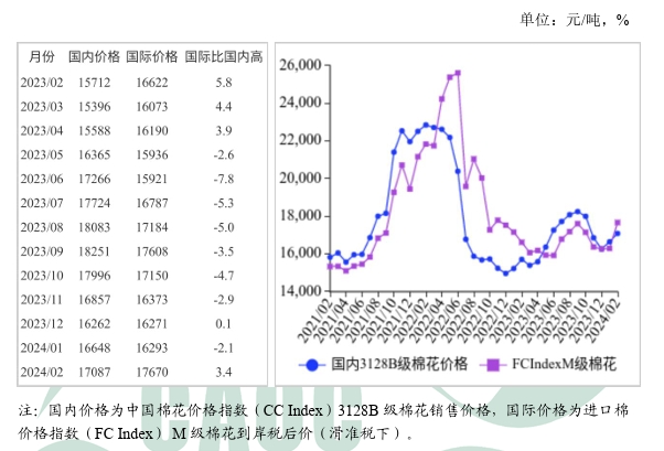 (二)國際棉價環(huán)比上漲。美國棉花加工基本結束,印度籽棉交售進入尾聲,國際棉花市場供應逐步減少;全球消費需求有所回暖,紡織業(yè)呈現一定改善跡象,加之美國農業(yè)部2月報告調減全球產量和庫存,國際棉價較快上漲。據USDA統(tǒng)計,截至2月15日,美國累計凈簽約出口2023/24年度棉花241.54萬噸,達年度預期出口量的89.9%,出口進度表現良好。2月份,Cotlook A指數(相當于國內3128B級棉花)月均價每磅98.78美分,環(huán)比漲7.5%,同比跌0.6%。
