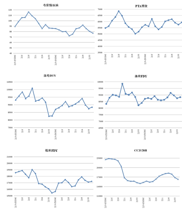 圖4 2022年1月~2023年12月我國化纖長絲、棉花、PTA期貨及布倫特原油價(jià)格走勢