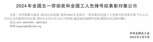 4月9日,中華全國總工會發(fā)布2024年全國五一勞動獎和全國工人先鋒號擬表彰對象公示名單?!?o:p>