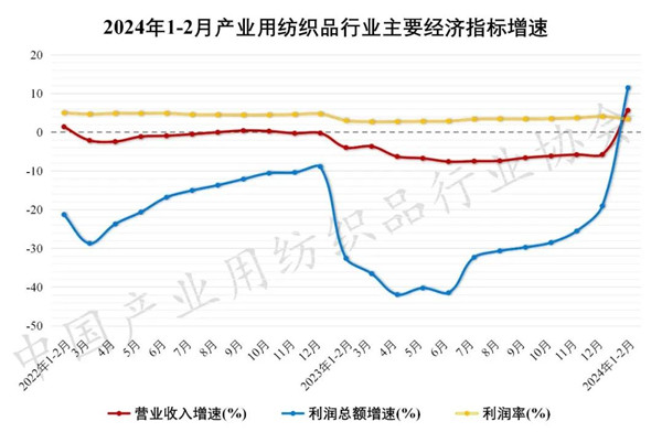 2024年前兩個(gè)月,全球經(jīng)濟(jì)態(tài)勢(shì)較為穩(wěn)定,制造業(yè)逐步擺脫疲弱狀態(tài);國(guó)內(nèi)經(jīng)濟(jì)隨著宏觀組合政策靠前發(fā)力持續(xù)恢復(fù),加上春節(jié)假期的有力帶動(dòng),國(guó)民經(jīng)濟(jì)起步平穩(wěn)、穩(wěn)中有升。2024年1-2月產(chǎn)業(yè)用紡織品行業(yè)的工業(yè)增加值增速自2023年1-2月出現(xiàn)負(fù)增長(zhǎng)以來(lái)首次實(shí)現(xiàn)轉(zhuǎn)正,行業(yè)經(jīng)濟(jì)開(kāi)局良好、量效雙增。