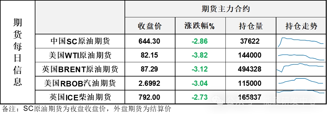 【1】WTI主力原油期貨收跌3.26美元,跌幅3.82%,報82.15美元/桶;布倫特主力原油期貨收跌2.81美元,跌幅3.12%,報87.29美元/桶;INE原油期貨收跌2.86%,報644.3元。