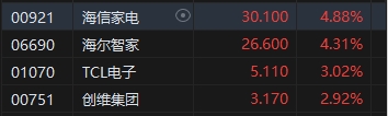 4月18日消息,今日港股三大指數(shù)集體收漲,截至收盤,恒生指數(shù)(16385.871, 134.03, 0.82%)漲0.82%,報16385.87點,恒生科技指數(shù)(3356.82, 16.60, 0.50%)漲0.5%,國企指數(shù)漲0.82%。盤面上,科網(wǎng)股多數(shù)上漲,網(wǎng)易、騰訊漲超1%,小米、百度跟漲,聯(lián)想、京東、阿里巴巴飄綠;保險、券商、銀行等大金融板塊全天強勢,中國太保(15.74, 0.86, 5.78%)漲近6%,中金公司(8.6, 0.25, 2.99%)漲近3%;家電股集體走俏,海信家電(30.1, 1.40, 4.88%)漲近5%;銅業(yè)股午后走強,五礦資源(3.93, 0.20, 5.36%)漲超5%;石油股全天表現(xiàn)低迷,中海油(18.4, -0.42, -2.23%)跌超2%。