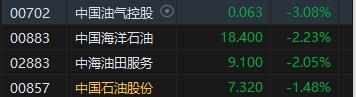 石油股全天低迷,中海油跌超2%。消息面上,市場對中東局勢擔憂情緒暫緩,疊加美國EIA原油庫存增加和美元走強,周三國際油價大幅走低,布倫特原油6月期貨結(jié)算價收跌2.73美元或3.03%,報87.29美元/桶;WTI原油5月期貨結(jié)算價收跌2.67美元或3.13%,報82.69美元/桶,為3月20日以來最大跌幅。