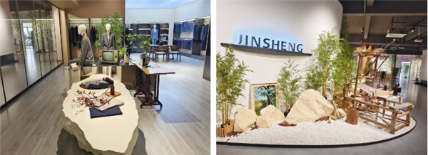 來到浙江金晟紡織有限公司,首先映入眼簾的是占地面積40畝的產(chǎn)業(yè)園區(qū)。據(jù)公司董事長金煥根介紹,園區(qū)于2022年建成,包含運營行政大樓、質(zhì)檢倉儲中心、生產(chǎn)中心和員工生活區(qū)等多元功能。在金煥根的帶領(lǐng)下,調(diào)研組一行參觀了金晟紡織最新打造的功能集成展廳,其中,竹纖維氛圍展區(qū)介紹了公司的材料集成系列以及公司的產(chǎn)品竹形象圖騰;國內(nèi)展區(qū)以每一季度的趨勢發(fā)布進行面料和成衣展示,圓臺區(qū)域打造了公司的竹纖維產(chǎn)品圖書館,集中展示竹漿纖維系列產(chǎn)品。