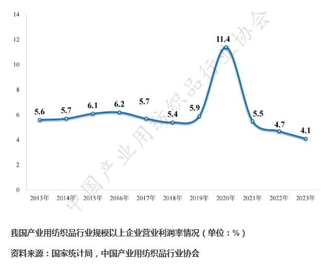 2023年,產(chǎn)業(yè)用紡織品行業(yè)的經(jīng)濟(jì)運(yùn)行呈現(xiàn)前降后升態(tài)勢。根據(jù)國家統(tǒng)計(jì)局?jǐn)?shù)據(jù),2023年產(chǎn)業(yè)用紡織品行業(yè)規(guī)模以上企業(yè)(非全口徑)的營業(yè)收入與利潤總額同比下降5.8%和19.1%,降幅分別較上半年收窄1.8個百分點(diǎn)和22.4個百分點(diǎn),特別是進(jìn)入12月后主要經(jīng)濟(jì)指標(biāo)出現(xiàn)了較大幅度的反彈。總體來看,行業(yè)企業(yè)的盈利能力普遍承壓,盡管4.1%的營業(yè)利潤率較上半年提升1.2個百分點(diǎn),但仍處于近十年來的最低點(diǎn)。