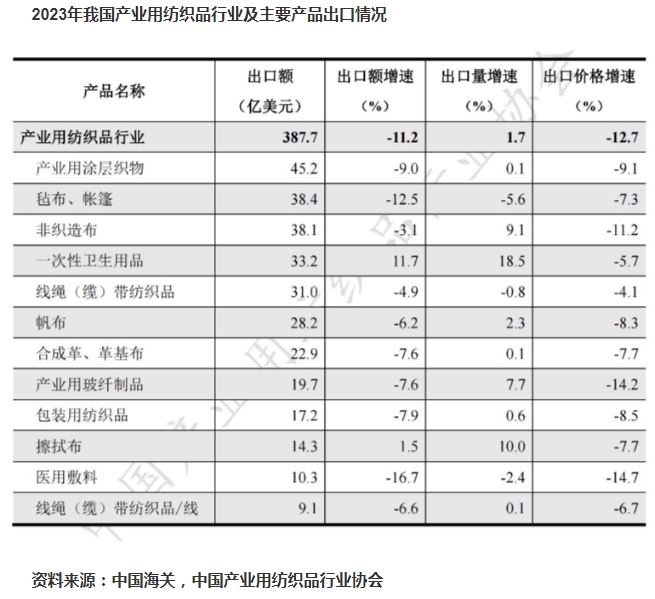 根據(jù)中國海關(guān)數(shù)據(jù),2023年我國產(chǎn)業(yè)用紡織品行業(yè)的出口額(海關(guān)8位HS編碼統(tǒng)計(jì)數(shù)據(jù))為387.7億美元,受海外市場需求疲弱的影響同比下降11.2%,但較疫情前整體出口規(guī)模仍保持穩(wěn)步增長,自2019年以來行業(yè)出口額的年均增長率為9.1%。中國產(chǎn)業(yè)用紡織品行業(yè)在產(chǎn)業(yè)鏈配套和技術(shù)創(chuàng)新方面,主要產(chǎn)品在質(zhì)量、服務(wù)和價(jià)格等方面都具有很強(qiáng)的競爭能力。